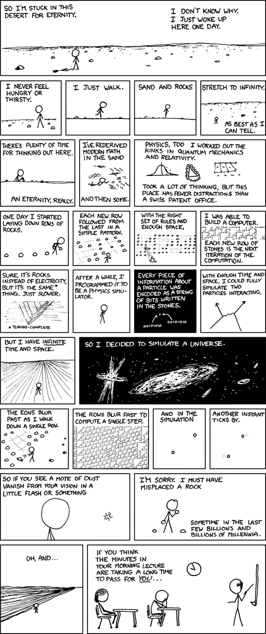 This by no means implies that there must be a step after which the simulation must stop (for example, heat death), but rather that each step of the simulation must be performed in a finite and predictable number of steps. This means that within the calculation of one step of the simulation, there should not be infinite loops and anything similar. This requirement is necessary because there is no point in running a simulation that can go into an infinite loop at some interesting point and then not produce any results.